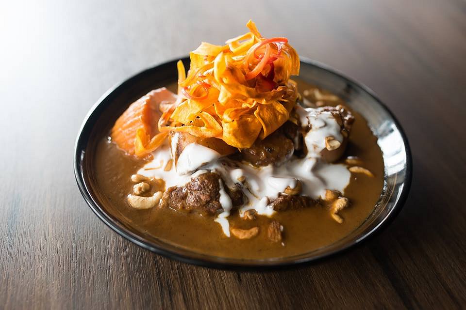 Gaeng Massaman – A mountainous serve of slow cooked tender ossobuco swimming in a thick and rich curry sauce. The beef is impossible to fault and I liked the addition of the marrow in the presentation. As a massaman should be, the gravy was earthy and nutty and quite irresistible. Best of all there was plenty of it. Usually a massaman curry comes with potato, in this case we have large chunks of sweet potato which ties in well with the beef and sauce. Finished with a generous sprinkling of cashew nuts and a swirl of coconut cream. We ordered a side of roti bread so I could mop up that yummy sauce until it was gone.