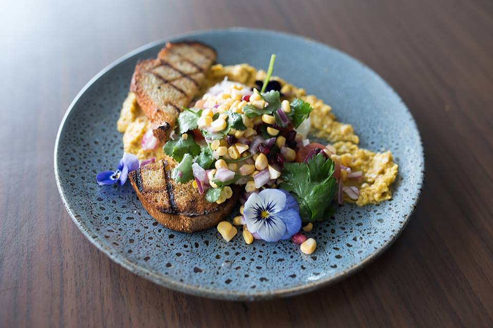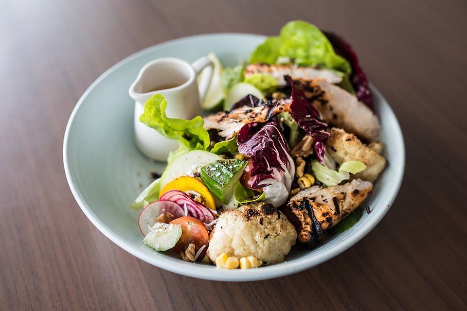 California Sunrise Salad with green oak, radicchio, heritage tomato, raw beet, cucumber, charred corn, coconut forbidden rice, quinoa, cauliflower, walnut, pomegranate, herbs, sumac, coconut flakes, and apple cider and agave dressing with chicken. If you’re looking for a salad that is the A-Z of superfoods, this is it. There’s so many flavour and textural contrasts going on, each bite becomes a party in your mouth. There’s the option to add various proteins to this dish so the carnivores can enjoy this too.