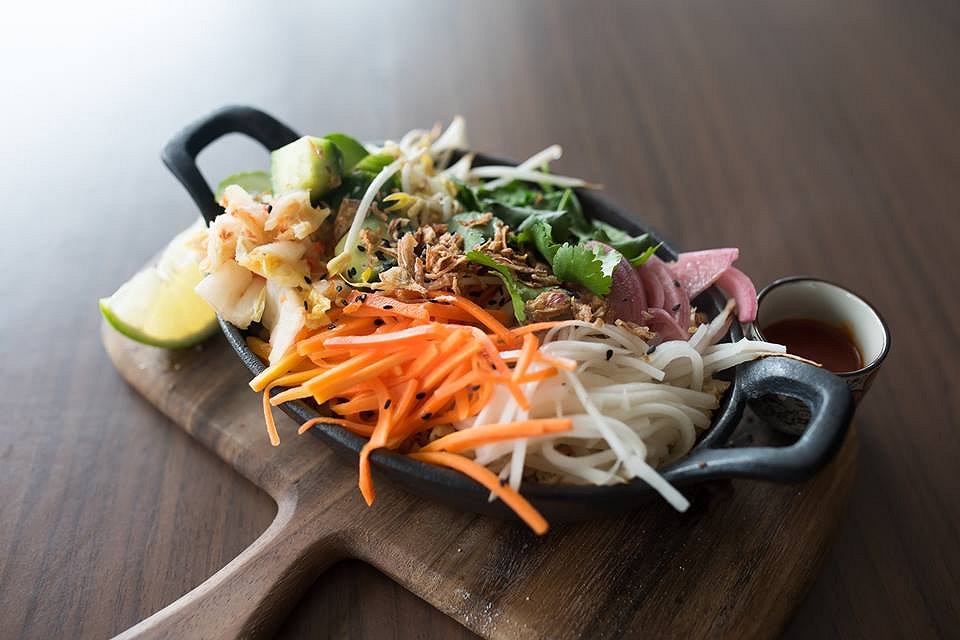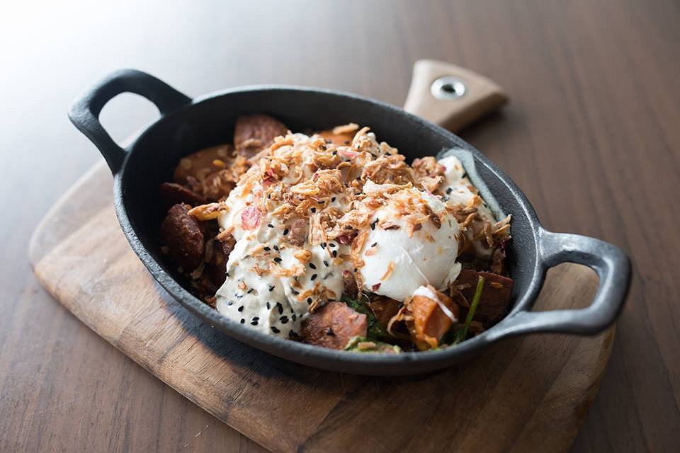 Cauliflower Fried Rice with Seared Prawns, fried egg, house kimchi, pickled vegetables, bean shoot, daikon, coriander, lime and sriracha. This is another offering served in a cast iron dish and you can see the Korean influences in this one. Beneath all the fresh Asian vegetables is a perfectly seasoned cauliflower rice. The idea is to mix them all together like a Korean Bibimbap while adding the spicy sriracha sauce. It’s a variation that surprisingly works.
