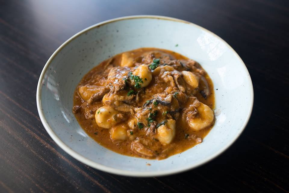 The tantalizing Brodetto di Pesce is up next. A very impressive seafood extravaganza of scampi, prawns, black mussels, pipis, fish pieces and potatoes cooked slowly in a light tomato broth. As it was brought to the table we were wowed, not only by the size of the dish but the aroma of seafood that came with it. This is one of those dishes that grabs the attention of other diners as it makes its way from the kitchen. You have to do a little work in this one to release the scampi and some prawn meat but for the most part it’s very accessible. The broth has a bisque-like quality with an underlying sweetness that comes from caramelising seafood shells. A generous scattering of chopped parsley adds freshness and ties all the flavours together. The toast on top is perfect for mopping up the last of the broth so you can savour every drop. If you think it can’t get any better order yourself a glass of the Bremerton Fiano – you can thank me later.