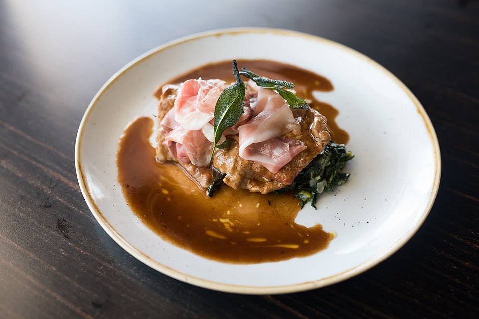 It’s been a long time since I’ve selected Saltimbocca on a menu and after today I’m wondering why. We had the Saltimbocca alla Romana pan fried veal topped with fresh prosciutto and a rich veal jus. I’m trying to stay away from the cliché “melt in your mouth description” but I can’t come up with any other way to describe this sublimely tender meat. The veal is served with braised onion, potato and silver beet which is delicious on its own and stands up with its own merit rather than a lacklustre side. We enjoyed a full bodied Hentley Farm Shiraz with this dish and it played very well with the hearty jus.