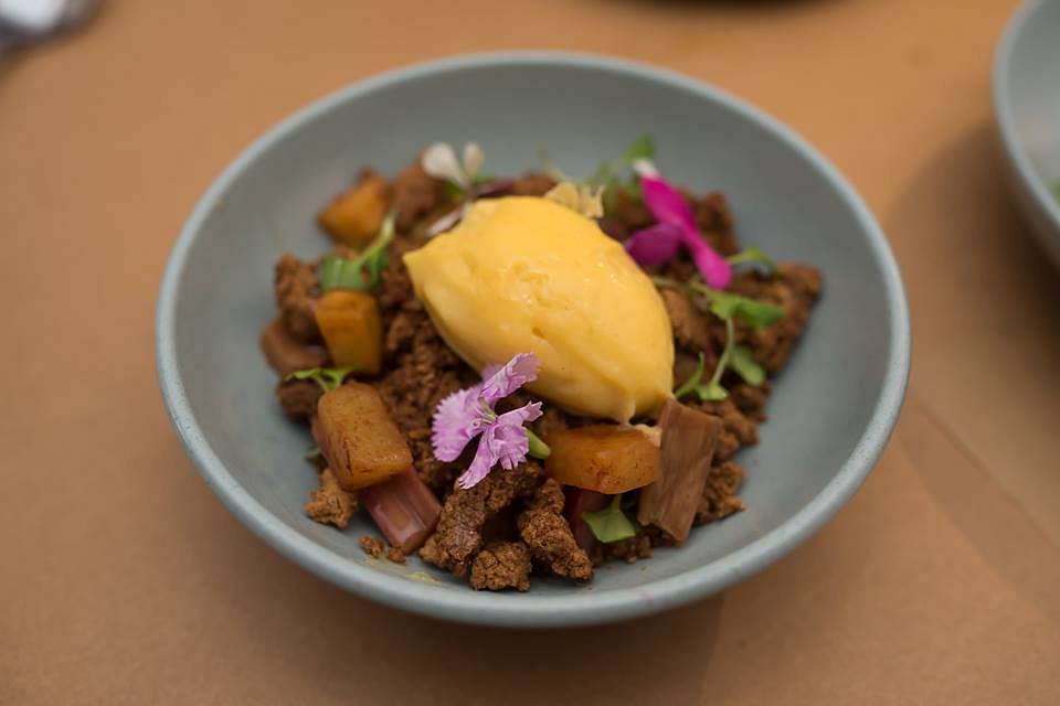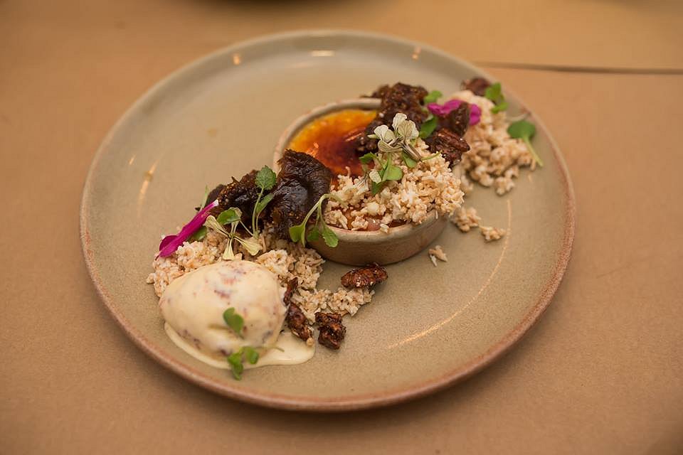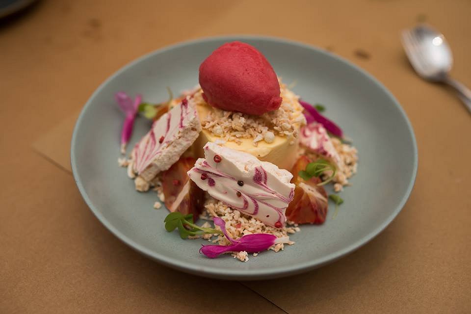 Our final tasting of the new spring menu were the desserts. An impressive round of four dishes to taste; a White Chocolate Parfait with blood orange sorbet and meringue, Chocolate Brownie served with torched banana and salted caramel ice cream, a Spiced Apple Crumble with rhubarb, lemon cream and gingerbread, and lastly a Vanilla Bean Brûlée complemented with poached figs and vanilla and cognac ice cream. All four desserts were paired with a Fortified Wine Tawny, the rich but sweet tones of matured fruit and aged oak, mixed with spices give off a raisin, toffee and walnut palate, with a warm finish. This paired well with the dessert dishes, accompanying the sweet flavours but adding a richness to the overall flavours. All desserts were made fresh as each component of the dishes are created on site, including the ice creams, sorbets and meringue. All dishes contain complimentary flavours, the spices and gingerbread in the apple crumble, the caramelised banana with the chocolate in the Brownie dish, the figs and smooth custard in the brûlée, and the citrus of the blood orange that cuts through the sweetness of the coconut and white chocolate.