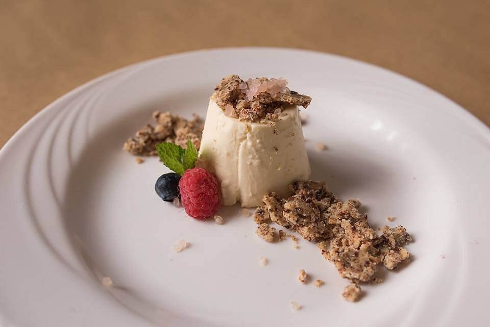 To satisfy our sweet tooth we started with the Panna Cotta, a celebration of Australian ingredients – the panna cotta flavoured with lemon myrtle, decorated with a plum crumble and beads of finger lime. Channelling the judges from My Kitchen Rules we conducted a “wobble test” and nearly launched the single blueberry garnish across the room. Yes – it wobbled. The panna cotta had a delicate flavour and luscious texture. The fruity crumb paired well in both texture and taste.