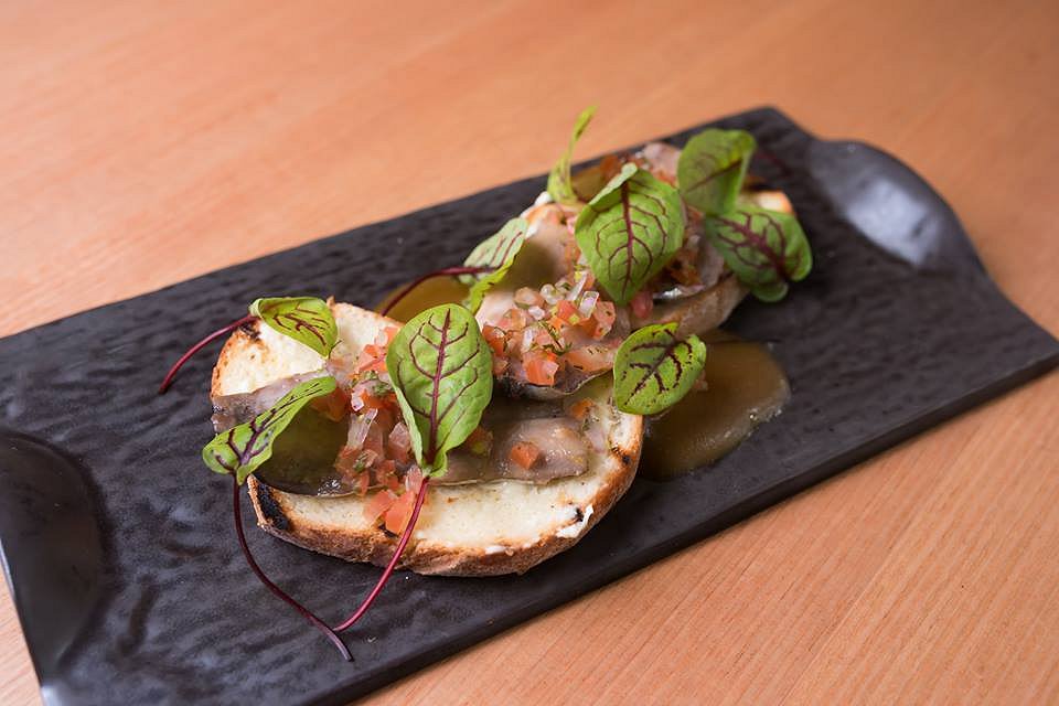 A modern twist on the 1960s budget British breakfast favourite – sardines on toast – The Stag’s Port Lincoln Sardines are exquisite. The sweet sardines, rich in natural fats, are served on two slices of lightly charred organic handmade sourdough. The bread is placed on a layer of tomato consume jelly which is the perfect combination of sweet and tart flavours. Red sorrel and native river mint dress the plate for a colourful finish. Dive into a plateful of modernised nostalgia with this rendition of sardines on toast.