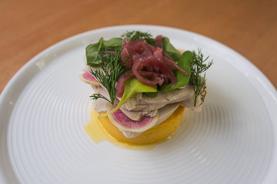 A succulent filleted free-range chicken breast is poached and lightly pan-seared is served on top of a generous portion of creamy polenta. Black truffle flavours sing through the dish for an earthy flavour, and fresh watermelon radish and warrigal greens provide a crisp, fresh element to your palate. This is the entrée for you if you’re feeling particularly peckish, as it is easily the largest out of the five.