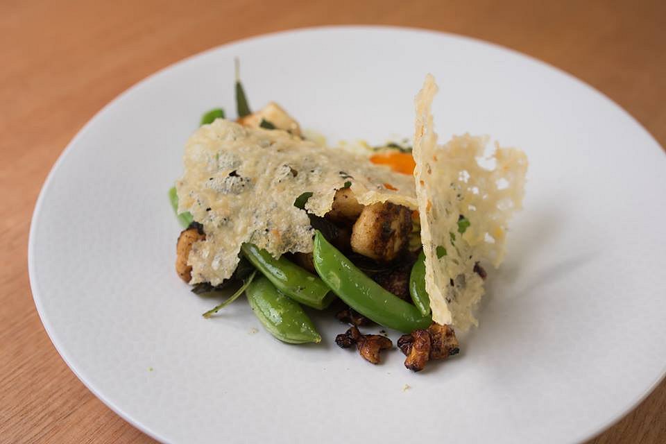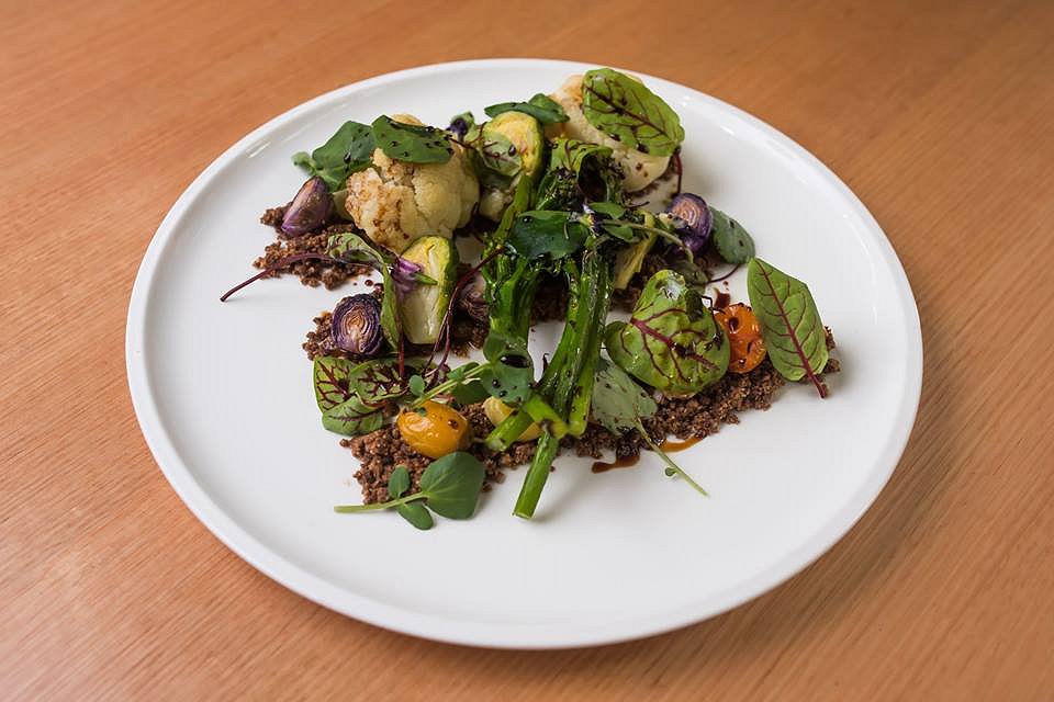 This is probably the prettiest main meal we’ve ever seen plated up. Resembling exactly what it is called, an Edible Garden, this dish is also vegan. A rich, earthy walnut crumble mixed with dukkah and spices acts as the ‘dirt’, while the veggies make up the vegetable garden. Sweet slow roasted vine ripened heirloom tomatoes, minuter cauliflowers, baby corn, spouts, pumpkin and wasabi flowers are plated above the walnut crumble, as if they are growing out of the ‘dirt’.