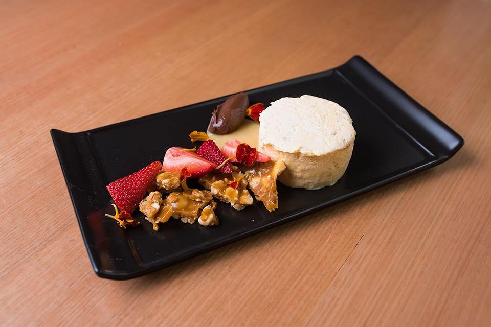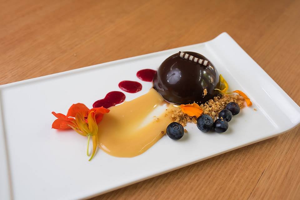 A decadent handmade chocolate caramel mousse with a super salty caramel centre is served on top of an almond and cacao crunch. Berry coulis, violet sugar and edible flowers dress the rich chocolate dessert. This is the perfect dessert for sharing, as spoonfuls of it go a long way!