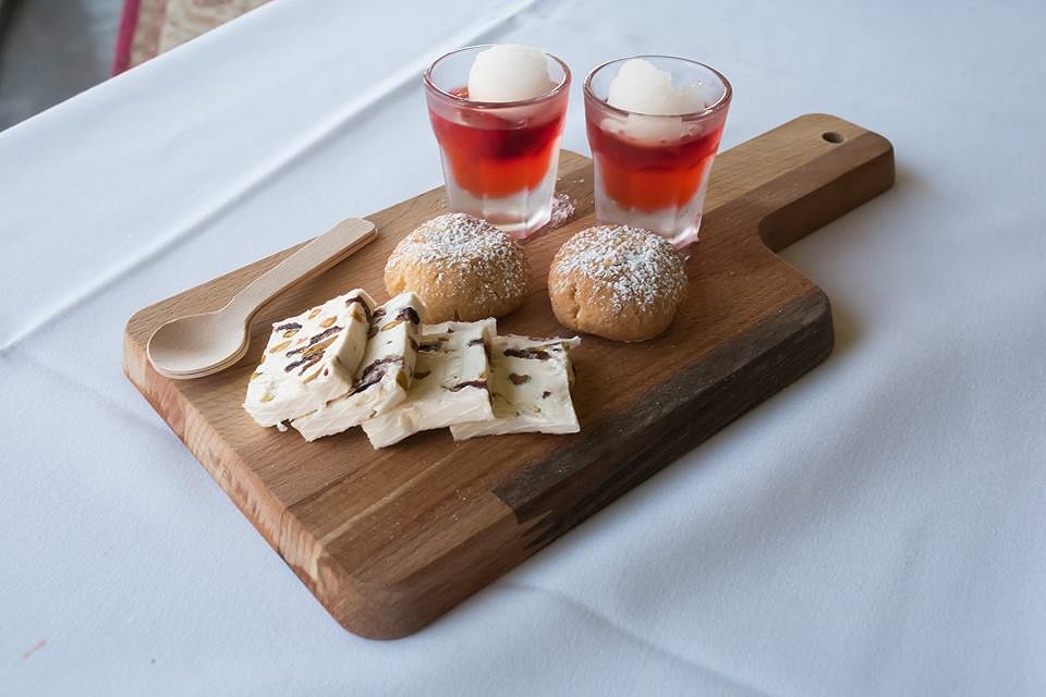 The dessert platter is a great finisher for a lovely long lunch. Sharp Parmigiano-Reggiano, Walnut Pan’pepato, and Galletti Biscuit as a savory conclusion to the menu as well as a soft Vanilla Pistachio Torrone, melt in your mouth Biscotti and a cheeky Aperol Jelly-shot with Prosecco and Raspberries (which we could have had a tray of! Yum)