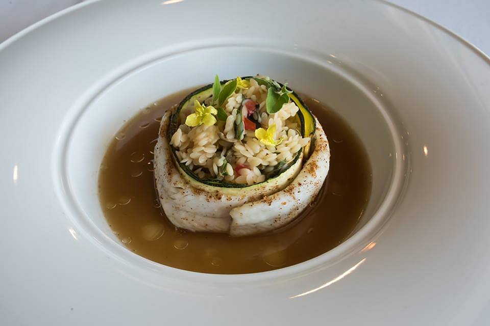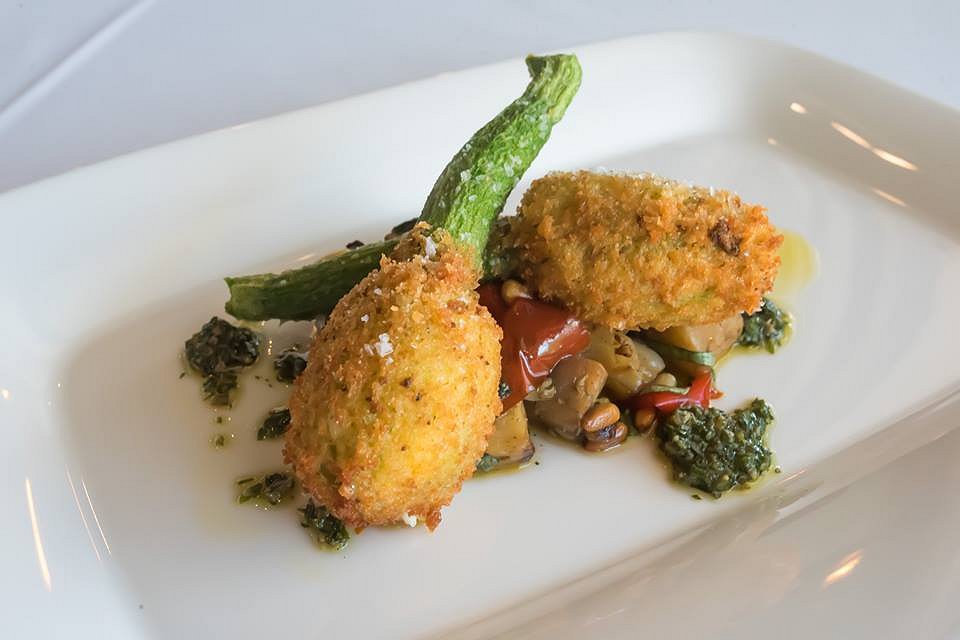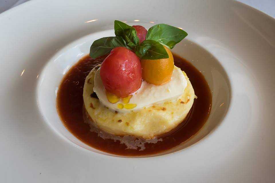 I started the day with a little skip in my step hoping that zucchini flowers that I have had many times would be on the menu today. I am delighted to report that they are. The romantic lemony ricotta bursts out of the delicate battered flower when cut and I am so pleased they are a wonderful as they were when I first enjoyed them so many years ago. The other components of the dish may have changed, the current plating of Fiori di Zucca comprises of a Mediterranean style salad of roasted eggplant and capsicum with capers and salsa verde.