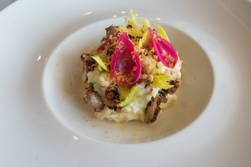 We determined that the Pulpo is very much like a gourmet potato salad and on a hot summery day it was heavenly. A mound of crushed potato is punctuated with hickory smoked aioli, cured egg, and spring onion, then decorated by gorgeous leaves of pickled onion and celery. Tiny bites of South Australian Octopus tentacle posses and earthy char and delicate texture.