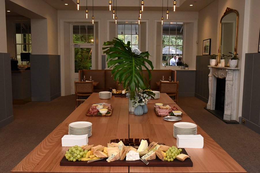 The dining space features a neutral palate, wooden furnishings and cement potted succulents perched on the large white windowsills. The decorated ceiling was highlighted with modern pendant light fittings, which made for a perfect space for drinks, cheese and conversation PLUS a lovely setting for evening meals in the restaurant.