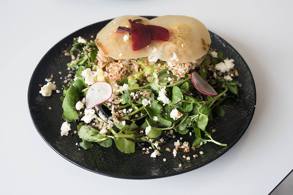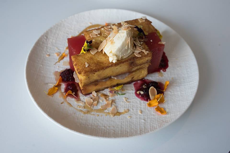 Another classic with a difference is the Dukkah Eggs, a take on avocado and eggs on toast. Here we have black sourdough toast spread with a creamy avocado mash. A couple of poached eggs are hidden under slices of apple cider vinegar compressed apple slices and a mound of watercress leaves and a sprinkling of quinoa. The eggs themselves are rolled in the Egyptian spice mix that dominates the palate through all the varied components. Lovers of dukkah will adore these eggs and it ticks a lot of boxes for the health conscious.