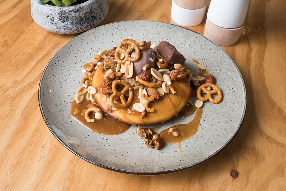 Our final dish to taste was the ‘Pancake of the Moment’. The Snickers Pancake was perfectly round and fluffy and had a beautiful presentation, topped with walnuts, peanuts, almonds, chocolate ice cream, caramel sauce, pretzels and a snickers bar. The thick ‘pancake of the moment’ always begins as a gluten-free base, using almond meal instead of flour, which gives the option to make gluten-free options to suit every customers needs.
