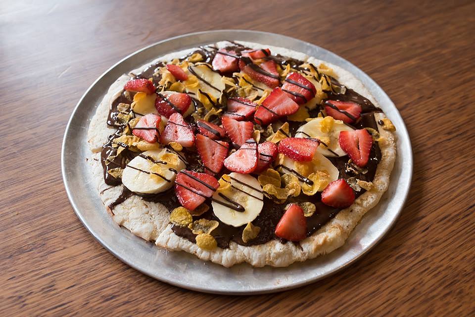 The Midnight Peanut Nutter was next to try. This vegan dessert pizza was made with peanut butter spread and was topped with fresh strawberries, banana and crunchy cornflakes. The pizza looked enticing with the fresh fruit on top and the peanut butter spread oozing out from under the chocolate sauce. The vegan chocolate base was sweet and the peanut flavour was strong but not too overpowering. The texture of the crunch was added with the cornflake topping and a lovely tart sweetness came out with the fresh strawberries and the creamy and fresh sliced banana also added a smooth texture.