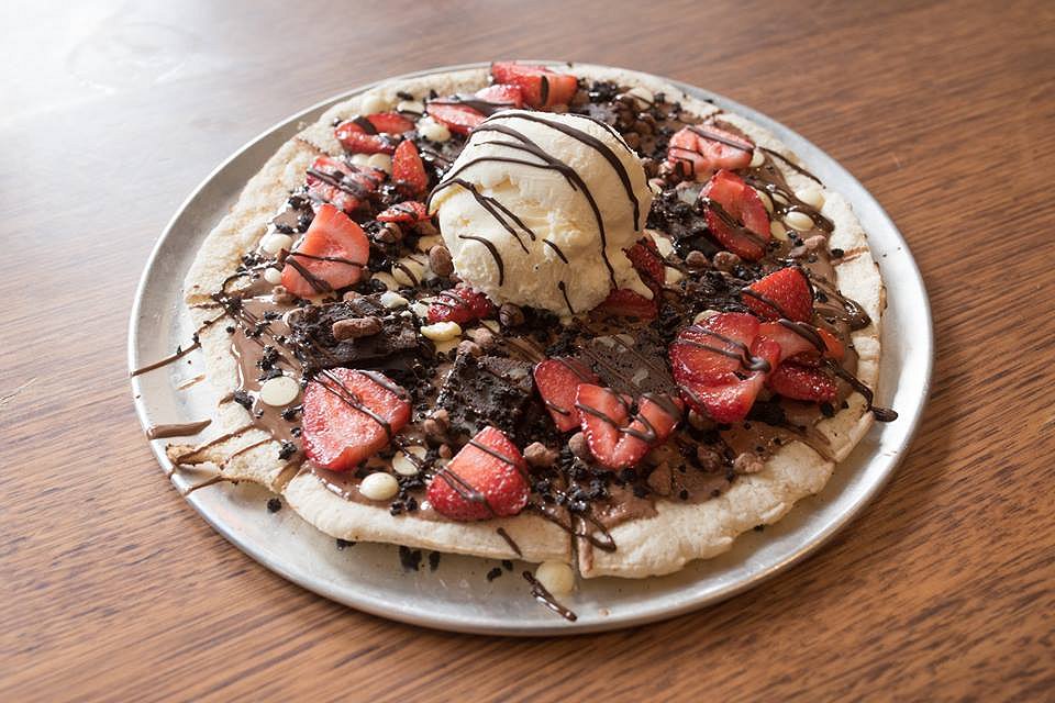 The next dessert pizza to try was the Bad Boy Brownie pizza. Made with Brownie chunks, strawberries, caramelised pecans and white chocolate drops, this pizza was also topped with ice cream and a chocolate drizzle. The instagram worthy pizza was truly chocolate heaven. The brownie pieces on the pizza were fudgy and slightly chewy, while the caramelised pecans added a lovely slight savoury crunch to the pizza. The fresh strawberries gave a sweet tang to the overall flavours and balanced out all the sweet chocolate flavours of the brownie, the sauce and the chocolate drops.
