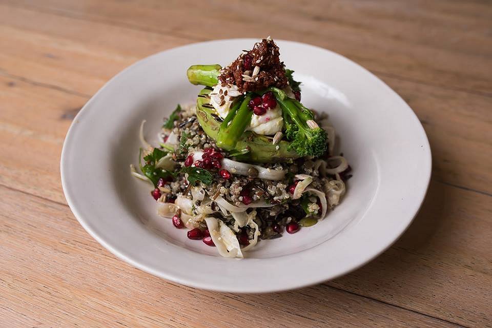 The Classic Super Food Salad is a very impressive, multi-dimensional salad based around mixed grains and pulses, including lentils, chickpeas and quinoa. Strands of shaved fennel and mint and pomegranate seeds add a fresh touch. Half a grilled avocado and some broccolini stalks top the salad crowned with ricotta and a blob of harissa dressing that brings a warm, smokiness to mix through the grains.