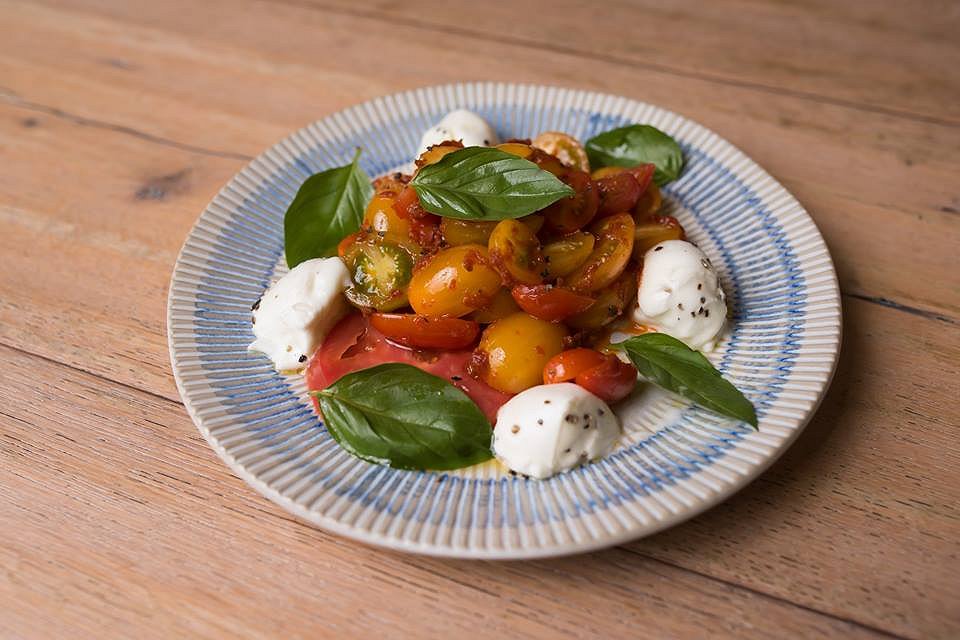Is there anything more quintessential summer, or Italian that a Caprese Salad. Soft, high quality buffalo mozzarella cheese, yellow and red assorted tomatoes, a good grind of course cracked pepper and olive oil. A hint of sundried tomato pesto weaves its way through the salad bringing a deep richness to what is otherwise very refreshing.