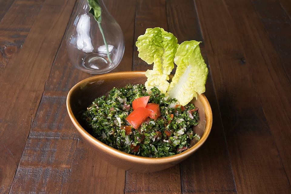 Lettuce, tomato, radish, cucumber, parsley, mint, capsicum, onion, and pomegranate molasses make up this classic salad. The unique thing about this one is that it is finished with pieces of deep fried Lebanese bread that somewhat remind us of healthy chips! Delicious!