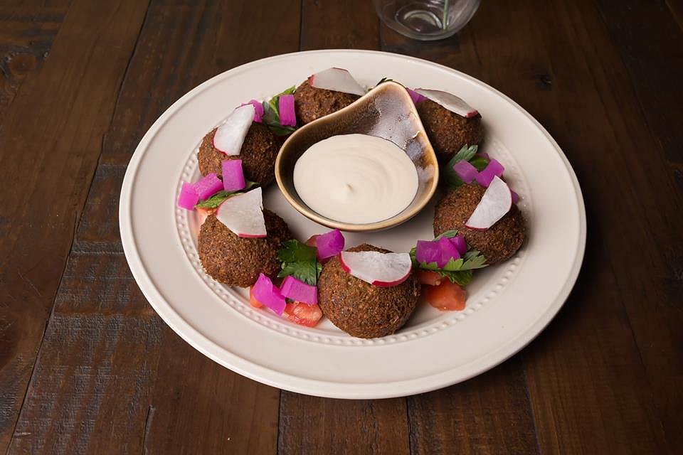 With colours representing the Lebanese flag, this dish features zaatar served on a freshly baked manoushi dough base, with a dollop of labneh (strained yoghurt), and topped with a sprinkling of diced tomato, olive and fresh mint. The dough base was soft and fluffy and the slight bitterness of the zaatar was complemented by the salty olives, acidic tomatoes and refreshing yoghurt and mint – a perfect way to start our meal!