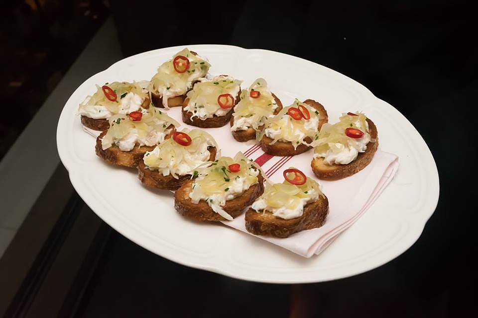King Crab Toast – King Crab meat mixed with creme fraiche is a balanced mixture of sweet and creamy, and goes very well on a crisp, rye toast.
