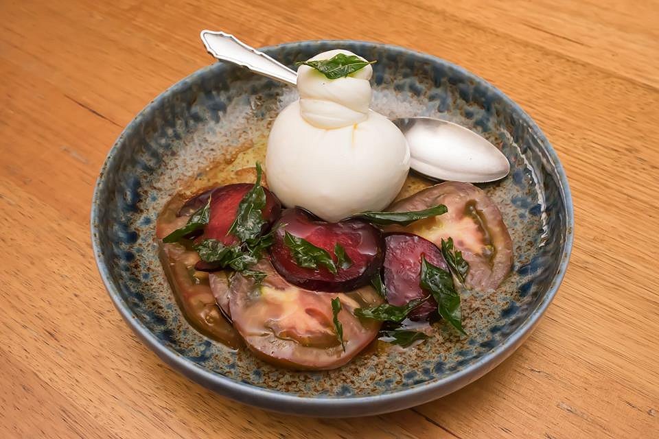 Next up a delectable, creamy Burrata with an almost liquid centre is paired with slices of Russian tomato and plum topped with fried curry leaves. Again we use bread to mop up all the components making a tantalizing medley.