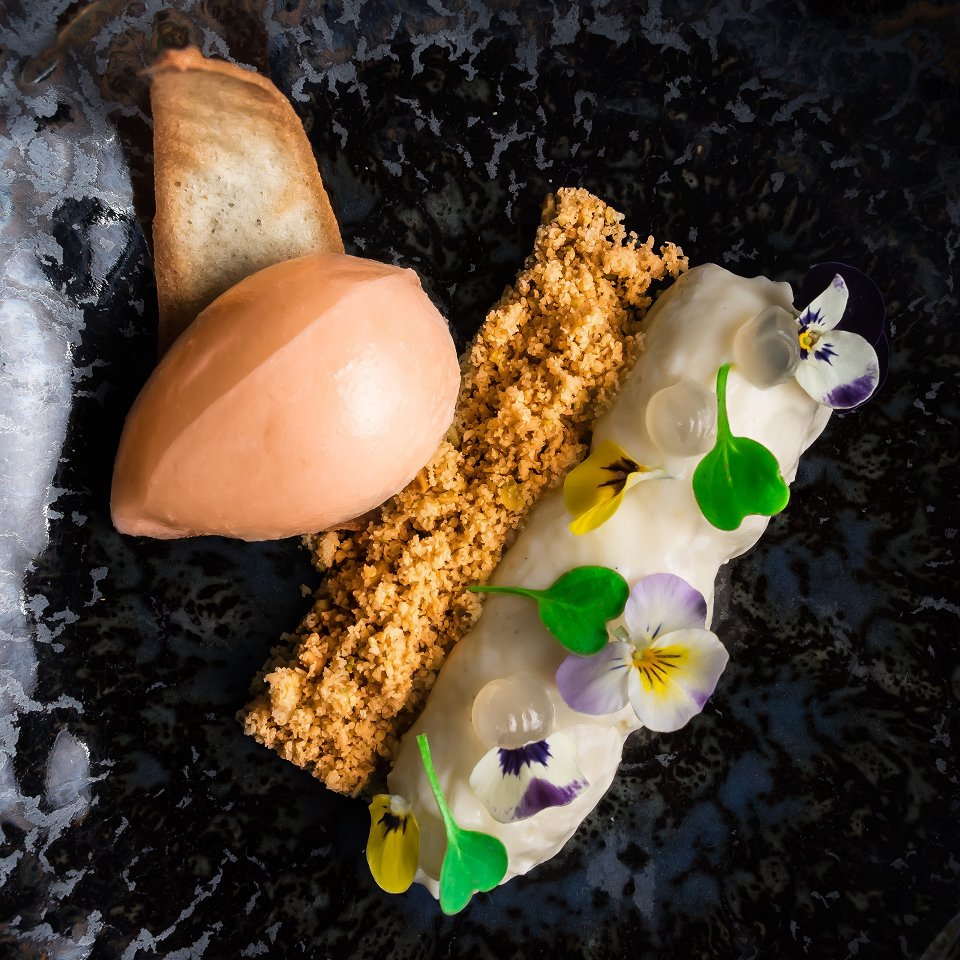 The Rhubarb and Pistachio is a visual masterpiece. The bright rhubarb gelee is gently laid over the smooth pistachio ice cream and honeyed pear gel. The pistachio sable mirrors a shortbread crumble and compliments the rest of the dish superbly. The Serafino Tawny has notes of mature fruit, aged oak, toffee and walnut, which align well with this delicious dessert.