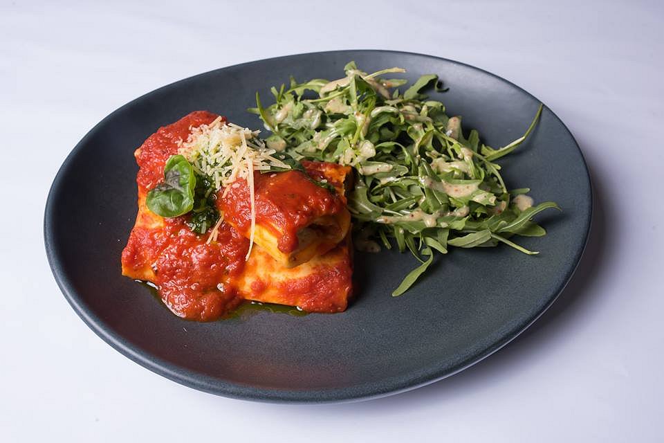 The Spinach & Ricotta Cannelloni was served with pesto, Parmesan cheese and a rocket salad. The Cannelloni was thick and large in proportion; a good serving but still overall a fairly light meal. The spinach and ricotta cheese centre was balanced well with the thick tomato base sauce that added a stronger savoury element to the cheesy cannelloni. The rocket added a fresher crunch, which was coated in a tangy salad dressing.