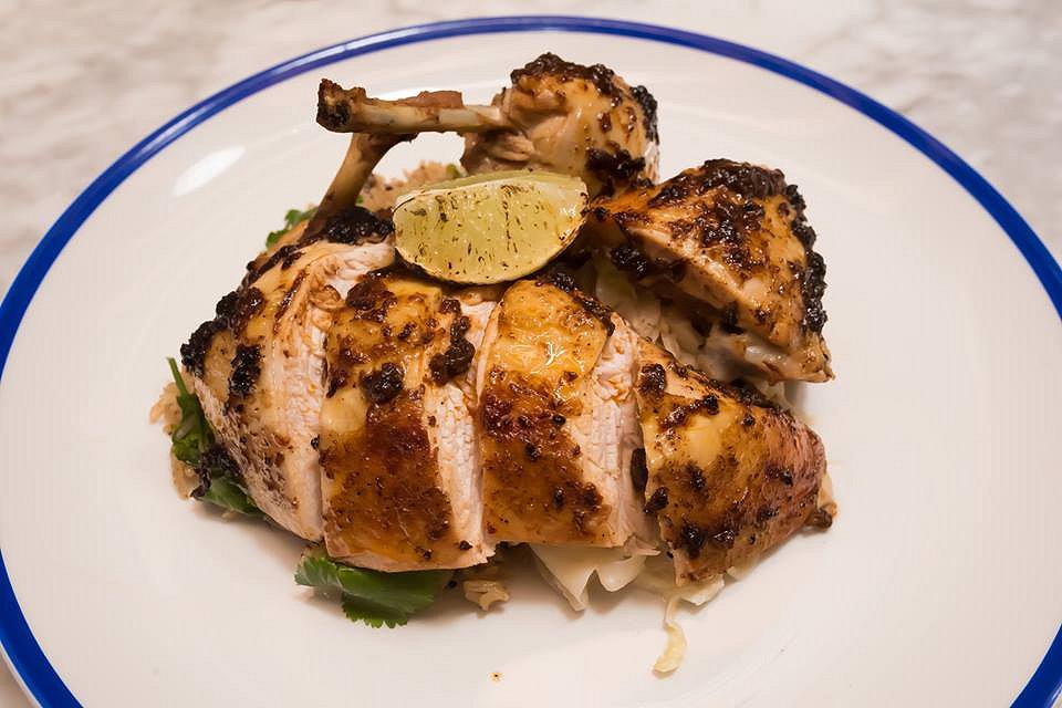The Jerked Half Chicken is brought to the table, its succulence showing on its glistening skin. Served on the bone the chicken is marinated in a Jerk seasoning that has a mild peppery heat. A warm slaw of cabbage and red onion is doused with a lemony dressing is that is light and flavorful and an accompaniment of spiced rice ties everything together well.