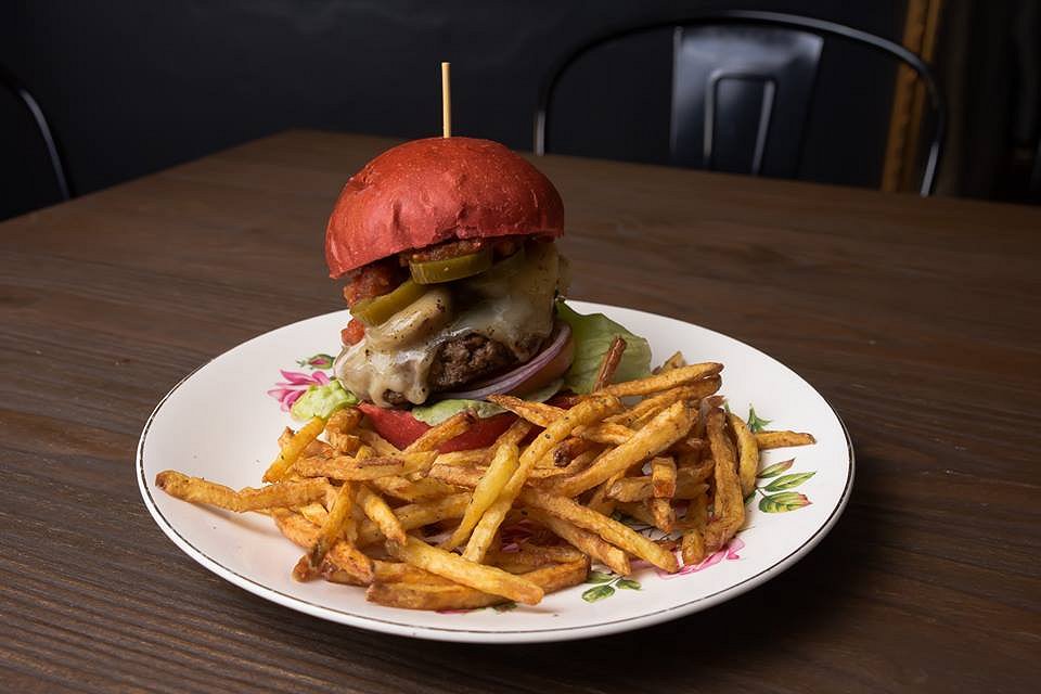The Angry Burger oozes with spicy chorizo sauce and organic homemade tomato jam. Jalapeno peppers peek out the side, while the beef patty is covered in melted cheese.