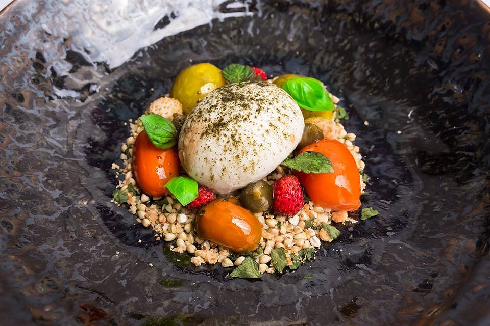 The breathtakingly beautiful Smoked Leeks entrée is reminiscent of a spring garden and competes with the beautiful Serafino gardens and lake that the restaurant overlooks. An airy asparagus mousse is topped with a sunny confit egg yolk that brings a silky richness to the plate. A multitude of components work together; toasted pine nuts, asparagus tips, leek ash, flowers and micro herbs but the star attraction is the namesake of smoked leek mousse piped into hollowed leek cylinders. As you eat them the smooth mousse pops out, filling your mouth with a smoky delight. Rounds of pickled zucchini and whipped chevre round the dish off nicely.