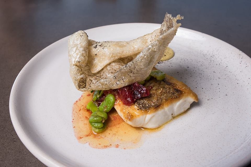 The meaty snapper fillet has been carefully handled and falls apart under our forks. Its delicacy is juxtaposed against the robust flavours of native saltbush and blood orange. A sail of crunchy fried fish skin completes the elegant arrangement.