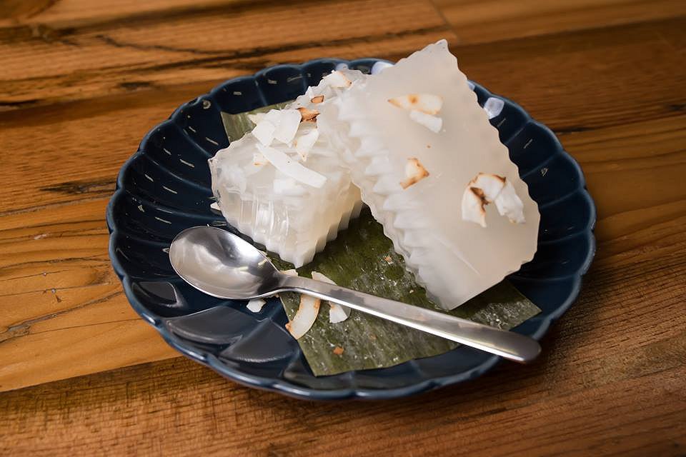 Infused with coconut essence, this agar agar jelly provided an unusually textured dessert. Topped with coconut shavings this mildly flavoured dish was certainly different, but flavoursome nonetheless.