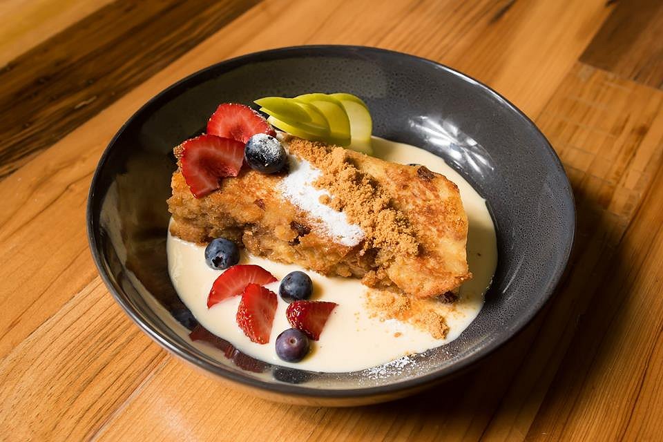Rum soaked bread and butter pudding, laden with notes of cinnamon and sultanas, made for a simply divine dessert. Bathed in luscious homemade crème anglaise, and served with fresh seasonal fruits, this dish was a beautiful balance of textural and flavourful bliss.