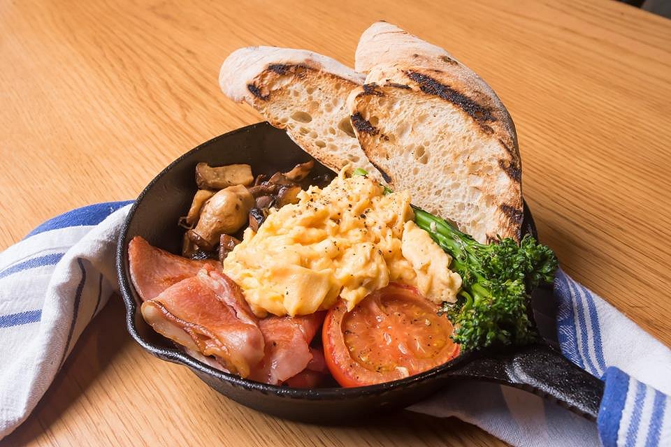 We love a good pun and we love this dish. Customers have a choice on how their eggs are cooked in this delicious breakfast. The dish is served with two slices of sourdough, grilled tomato, sauteed broccolini, earthy mushrooms and rashers of bacon.