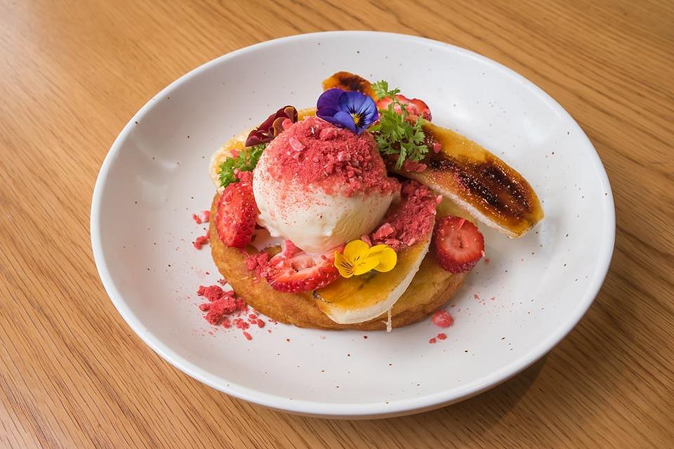 Breakfast and dessert are often intertwined as is the case with this dish. Sitting on top of the thick and fluffy pancake were caramelised banana, vanilla bean ice cream, strawberries and freeze dried raspberries.