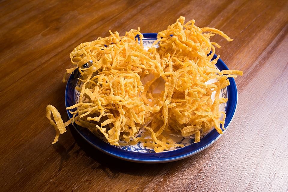 These balls are so spiky you can hurt yourself if you’re not careful. In its inner core is a juicy minced prawn dumpling wrapped in a crunchy fried noodles.
