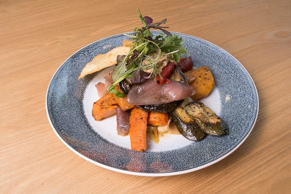This medley of seasonal roast vegetables was comprised of pumpkin, sweet potato, carrot, zucchini, capsicum and eggplant. Garnished with caramelised garlic cloves and teamed with crisp pitta and homemade smoky babaganoush, this dish was deliciously satisfying.