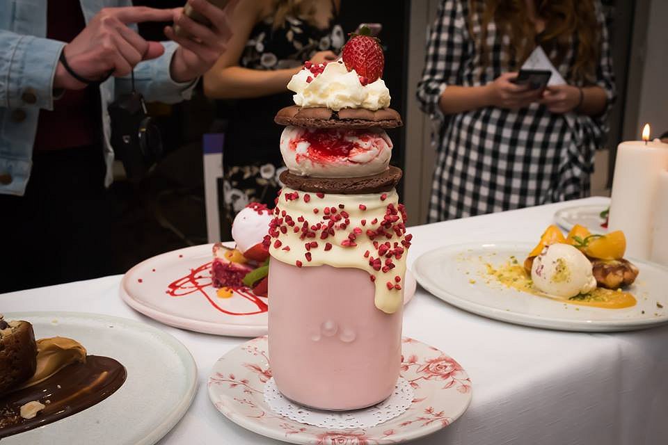 Taking crazy shakes to the next level is Bing’s Cookie Sandwich Shake. Served in a mason jar coated in melted white chocolate and freeze dried berries is their deliciously creamy and vibrant pink wild strawberry milkshake. On top lies another cookie sandwich, with a scoop of wild strawberry ice cream between two Butterbing Choc-Brownie Cookies.