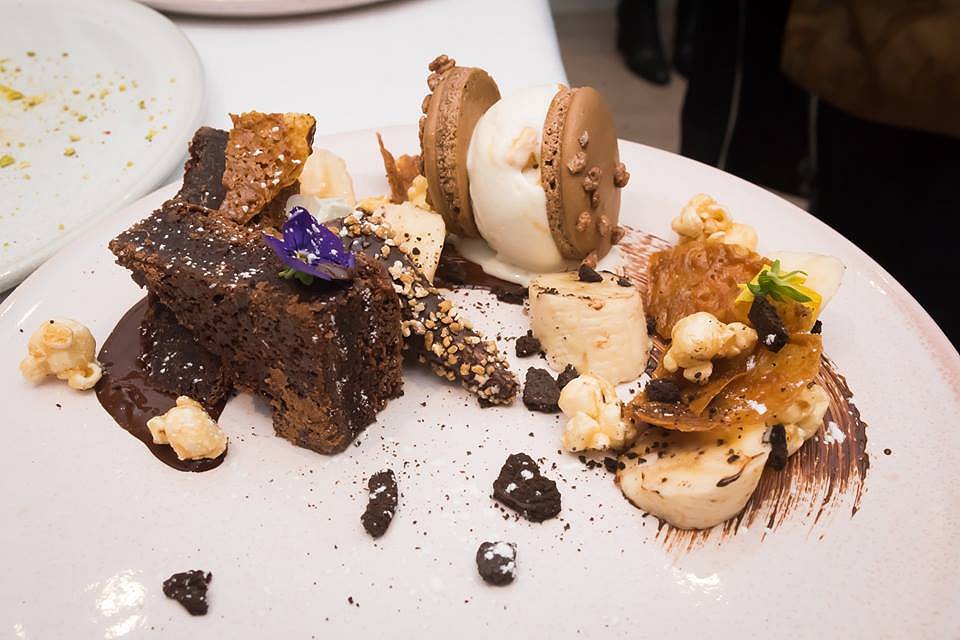 This dessert has been redesigned to look even better! On one side of the plate is a chocolate macaron, filled with a scoop of their signature St Louis ice cream. Pieces of chocolate sponge cake, dulche de leche, sliced banana and caramel popcorn are scattered around the macaron, all brought together with a creamy hazelnut ganache.