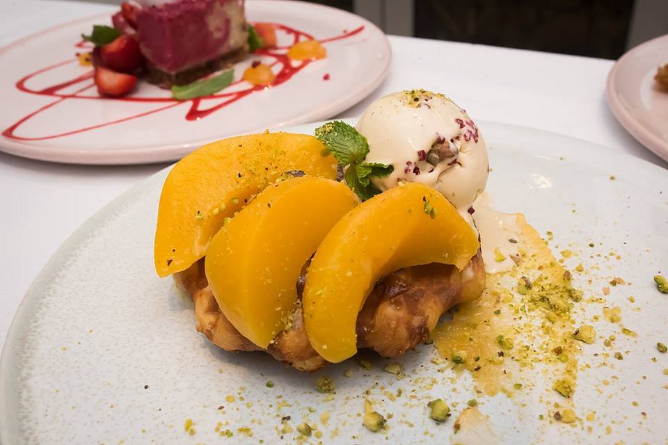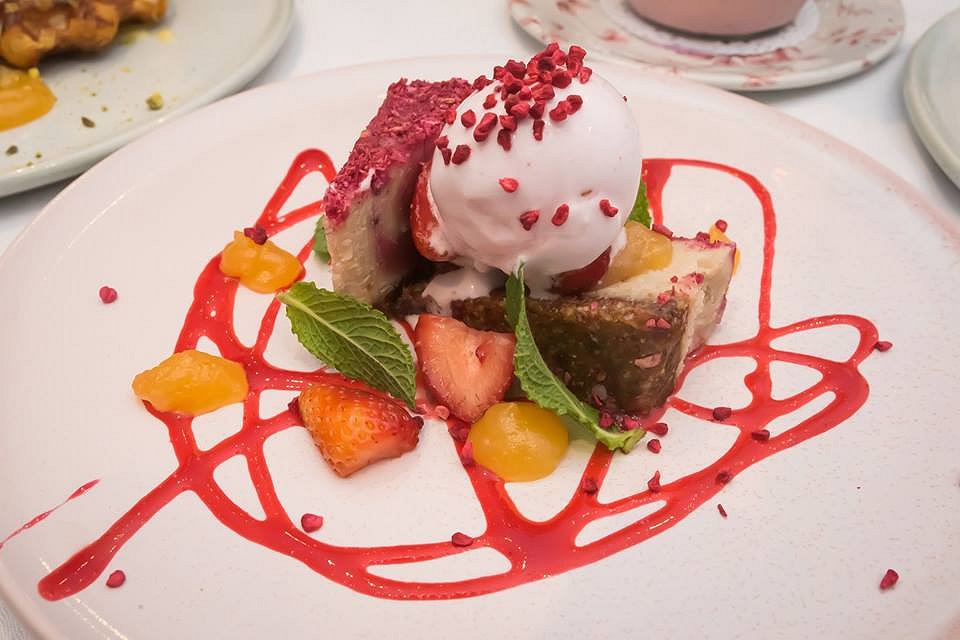 Even vegans are catered for at St Louis. The vegan berry slice is served with strawberries, mandarin, lemon curd and vegan crumb. The dessert is topped off with a refreshing scoop of raspberry sorbet.