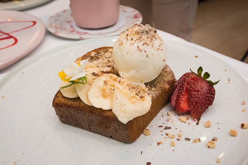 Who doesn’t love good banana bread? On top of a thick slice of toasted banana bread is melted dark chocolate sauce, peanut butter and French vanilla ice cream. Topped with caramelised banana, crushed hazelnuts, shortbread crumb, strawberry and edible violets, this dish it the perfect sweet tooth’s breakfast or brunch option.