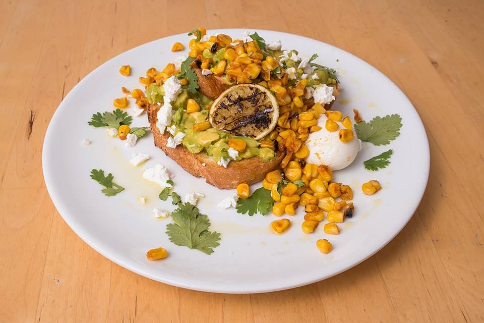 Toasty Avo – smashed avocado on sourdough toast with smokey grilled corn, feta, coriander & lime (with added poached egg)