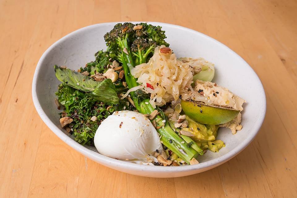 Green Goodness Bowl – seasonal greens, avocado, quinoa, hummus, homemade dukkah, kraut-chi & lime (with added poached egg)
