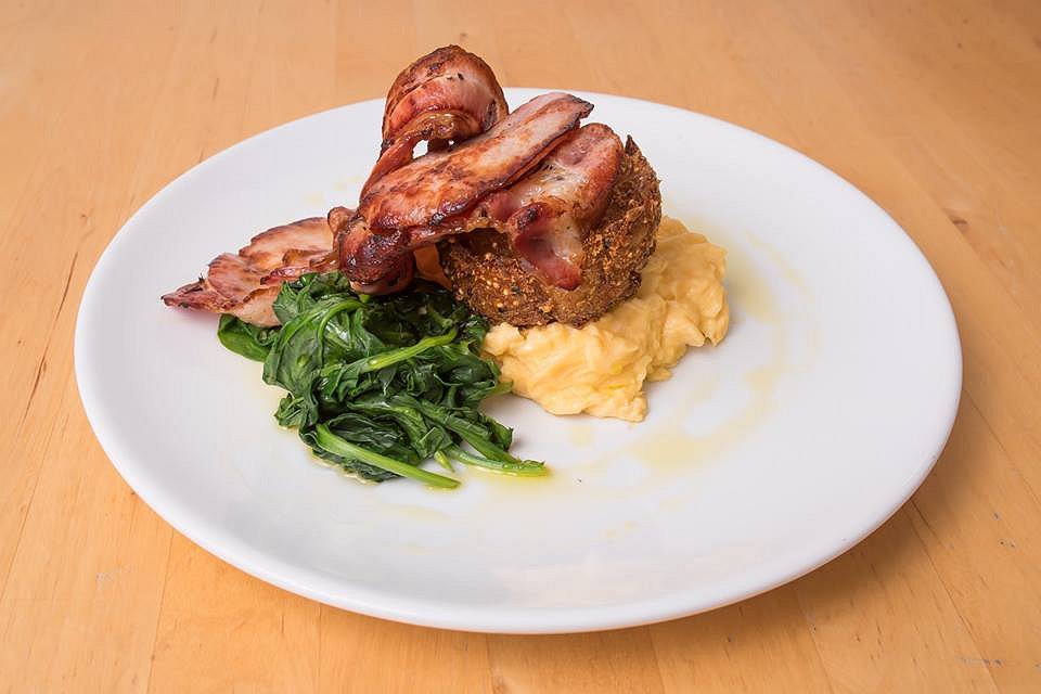 Potato, Quinoa & Rosemary Rosti served with scrambled eggs, sautéed spinach & bacon