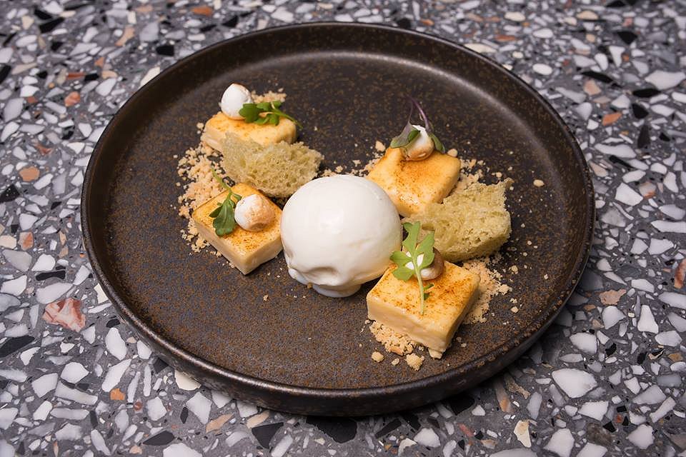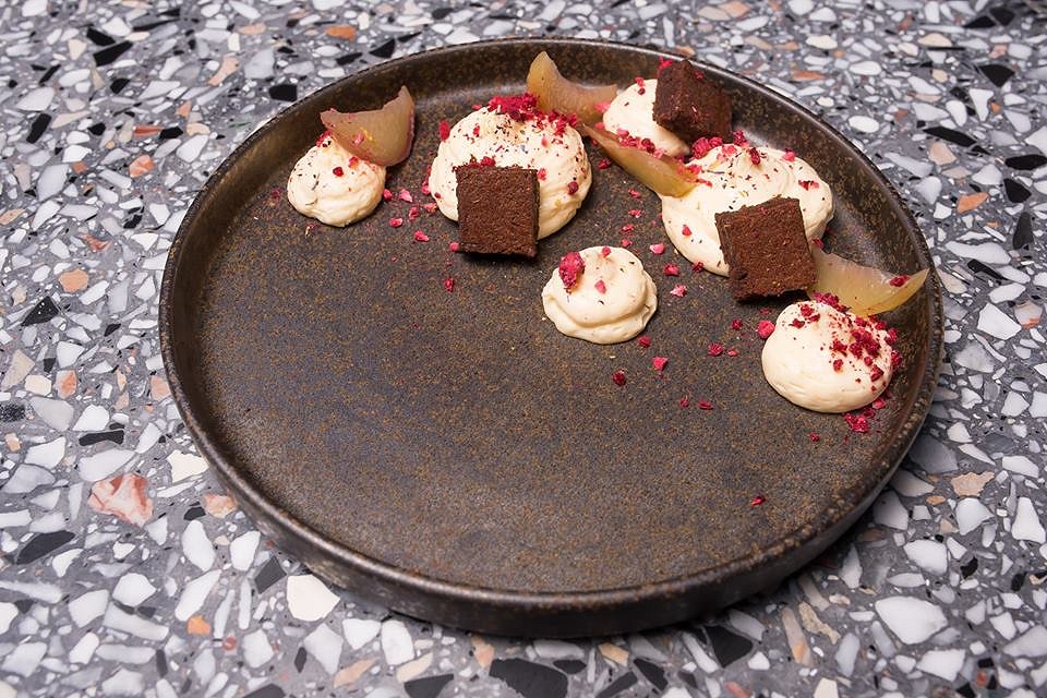 Smooth and fluffy mousse is expertly piped onto the plate and topped with orange brownies and dried raspberries. The mousse was so soft it was like eating a pure cloud. The brownie was rich and packed with a citrus kick, paired with a sprinkle of sweet raspberries. The different textures in this dessert makes it unique and one of our favourites.