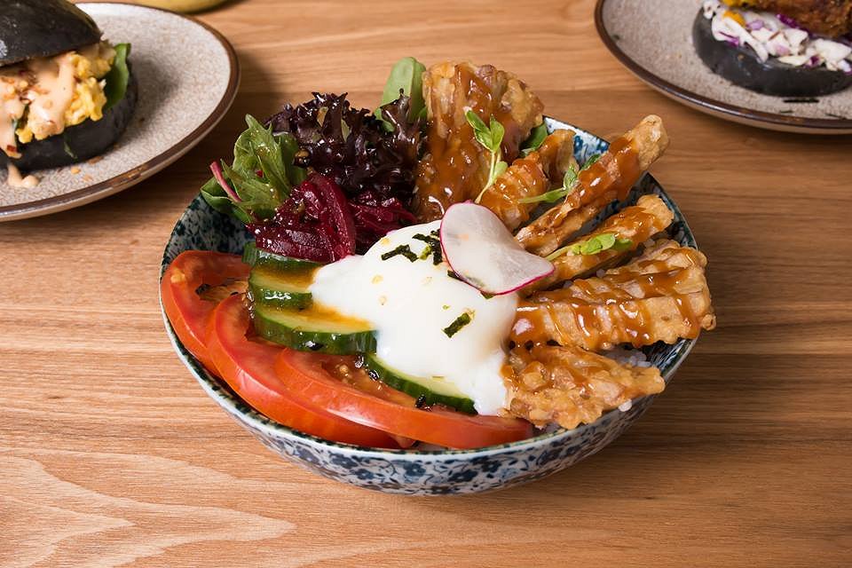 This dish was simple yet memorable. With sliced tomato, cucumber, and beet, the real hero of this dish was definitely the tempura eggplant. And I say this as someone who usually doesn’t like eggplant! It was just the beautiful slightly salty-sweet tempura batter and small, crunchy, bite size pieces that won me over! We chose to have this rice bowl with the onsen egg, which broke satisfyingly over the sticky rice as soon as we poked it. Topped with a delicious peanut caramel sauce, this dish was definitely a winner for us (even for a doubtful eggplant-hater like me!).