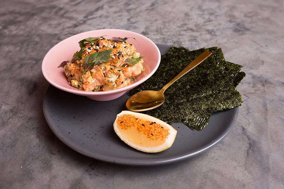 Up next we had the Sake Cured Salmon with avocado, smokey miso and nori. Think, deconstructed sushi roll, this is exactly what his dish reminded me of. The salmon itself was similar to something that you would find in a poke bowl, the miso being a highlight as it gave the dish that extra burst of flavour. The nori paper was fresh and wrapped around the delicious salmon to make it into a mini sushi hand roll.