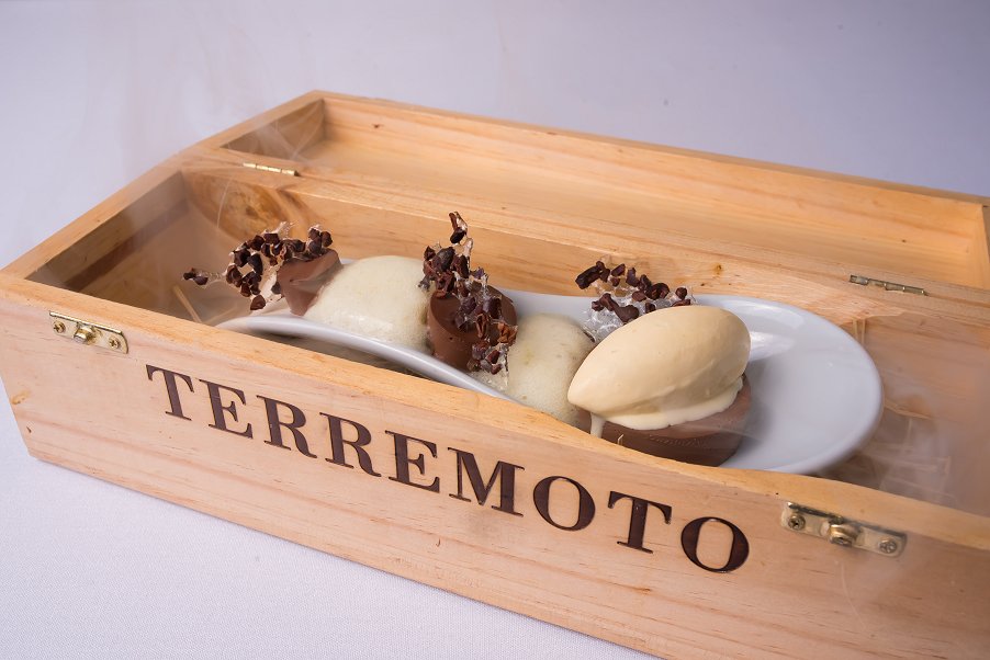 The Applewood Smoked Chocolate mousse was served with fig leaf ice cream, apple foam and cocoa nib glass. Presented in a wine box, the smoke was trapped inside, making for a lovely display when we opened the lid at our table. Rich smoky flavours dominated the dish, complimenting the deep chocolate flavours of the smooth and creamy mousse. The cocoa nib was stronger in flavour, rich and dark that gave a slight bitter tang that balanced with the apple foam. The apple was a lovely flavour that helped lift the heavier smoky chocolate flavours. The fig leaf ice cream was creamy and smooth and helped to balance the dish’s strong smoky tones with a sweeter flavour.