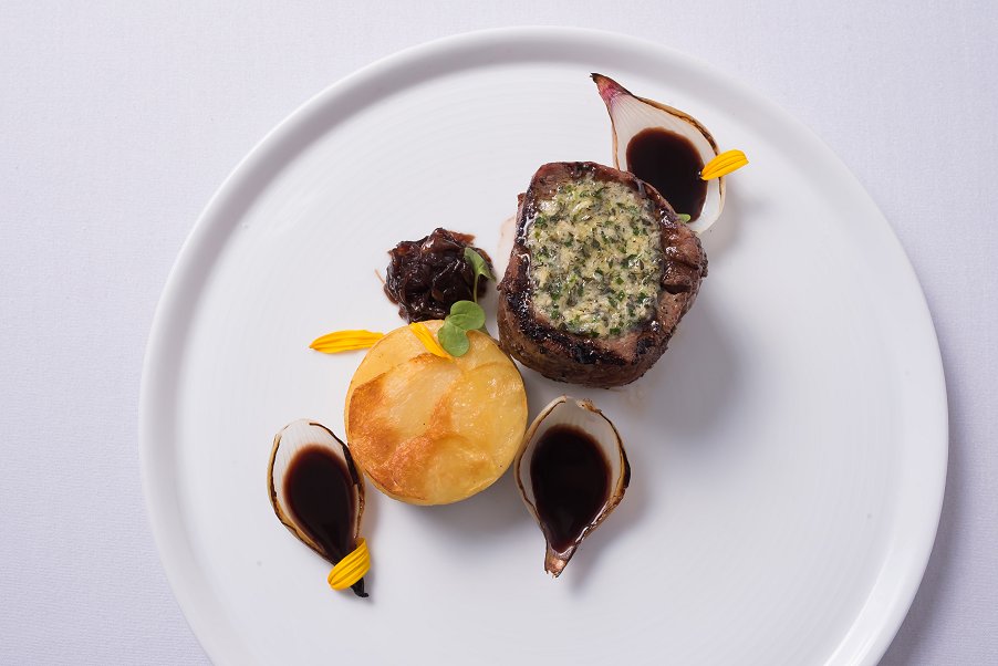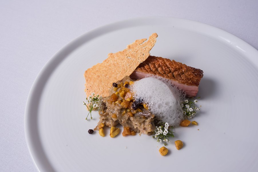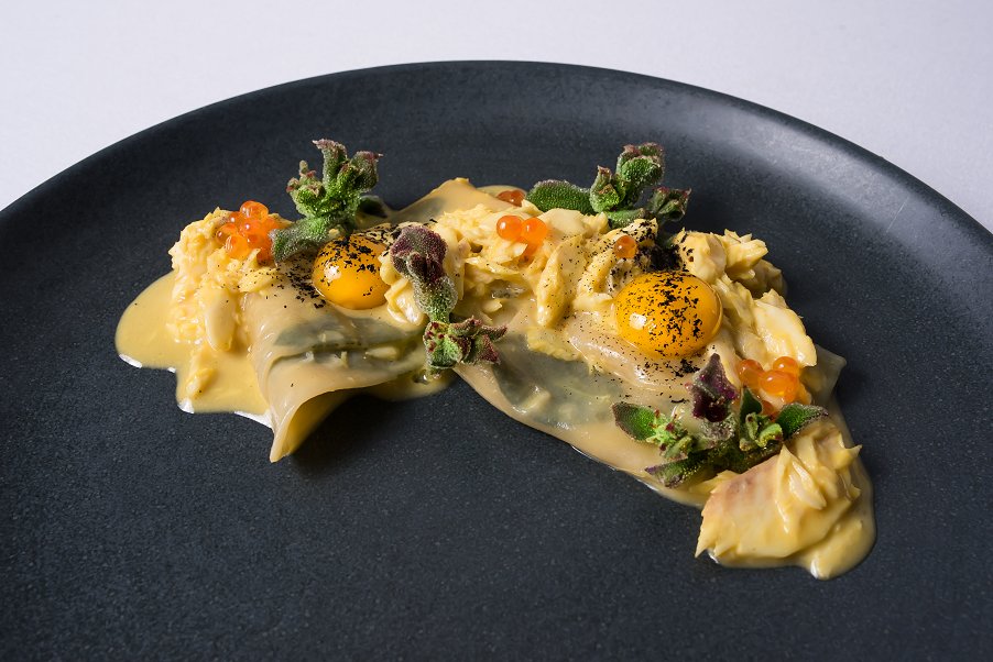 The Garden Leaf Maltagliati pasta was made with King George whiting nage, smoked salmon roe, confit quail egg, lemon aspen oil and garnished with fresh ice plant. The rough-cut pasta was cooked well and tasted fresh and smooth. It was made with fresh herbs pressed in-between the pasta sheets, which enhanced the flavours. The King George whiting was cooked to perfection, tender and full of flavour that balanced with the sourness of the ice plant and the lovely salty pop from the salmon roe. The smooth and creamy quail eggs were deliciously runny, adding lovely rich sweeter tones to the pasta and balancing the slight tang of the lemon aspen oil. Overall this entrée was full of flavour and held a lovely golden colour that resembled the warm sun and the golden leaves of autumn.