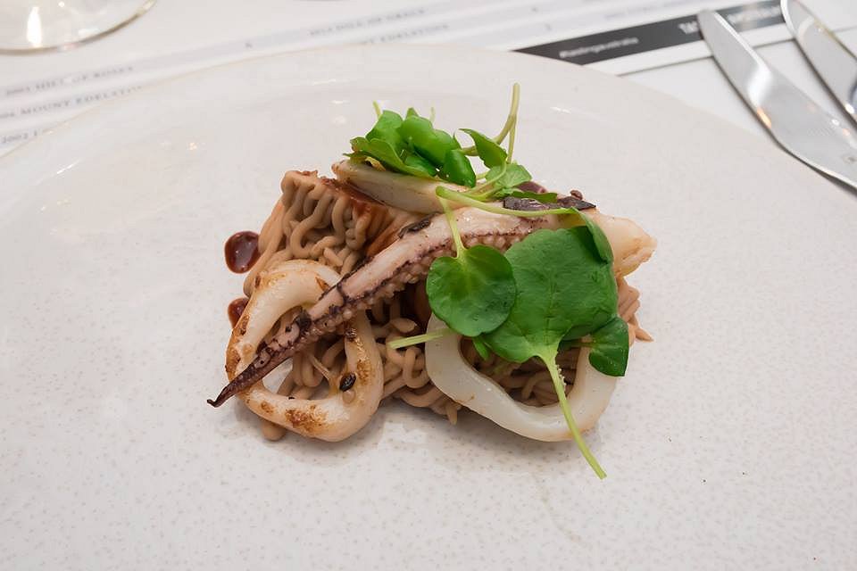 The generous morsels of squid were perfectly cooked. It sat on top of a bed of mashed chestnuts mixed with extra virgin olive oil which gave it a smooth and creamy texture. This was balanced by strands of fresh, leafy watercress. This dish was paired with semillon which had clover blossom aromas, citrus flavours, herbacious notes, and good minerality and acidity. The older semillon had a more prominent flavour of honey on toast.